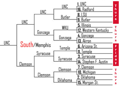 I like an all-ACC match-up in this region. Clemson should be motivated after losing to lowly Georgia Tech, UNc should have a healthy Lawson by then. Get ready for a serious barnburner.